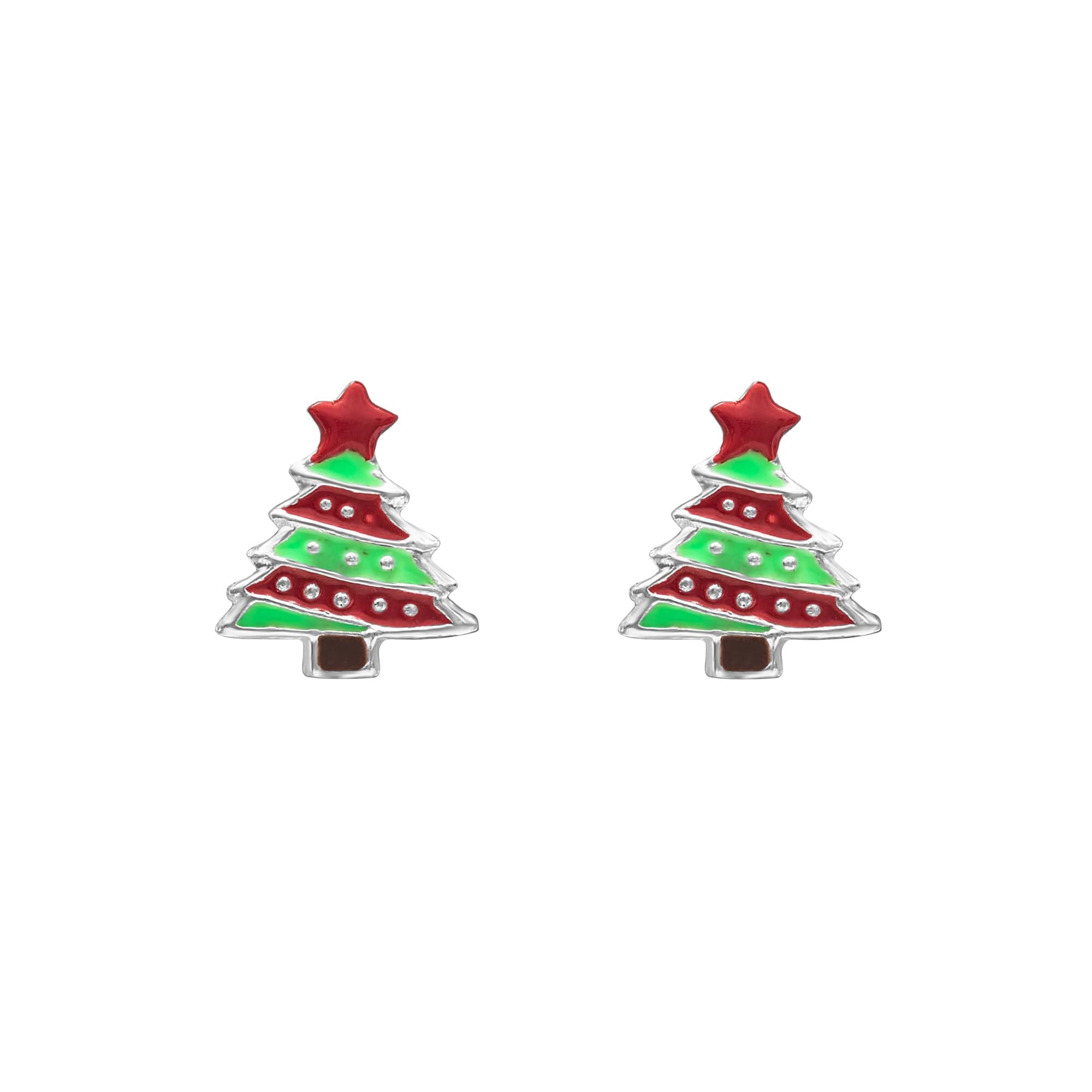 Ag Sterling Green and Red Christmas Tree Stud Earrings