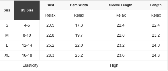 L – 12/14, M – 8/10, S – 4/6, XL – 16/18