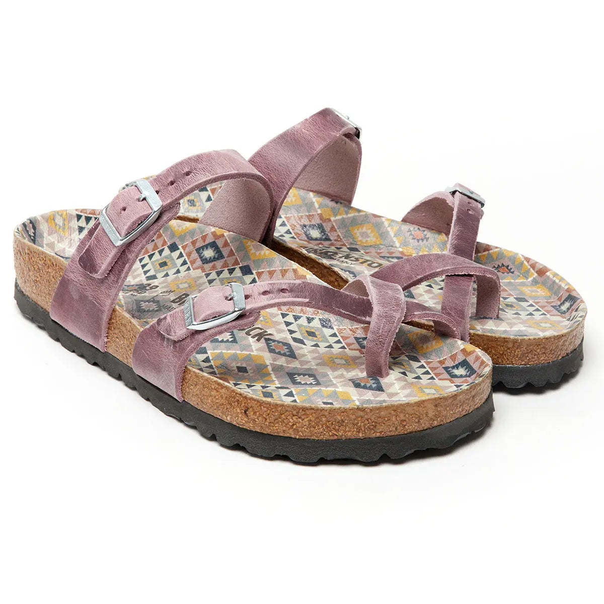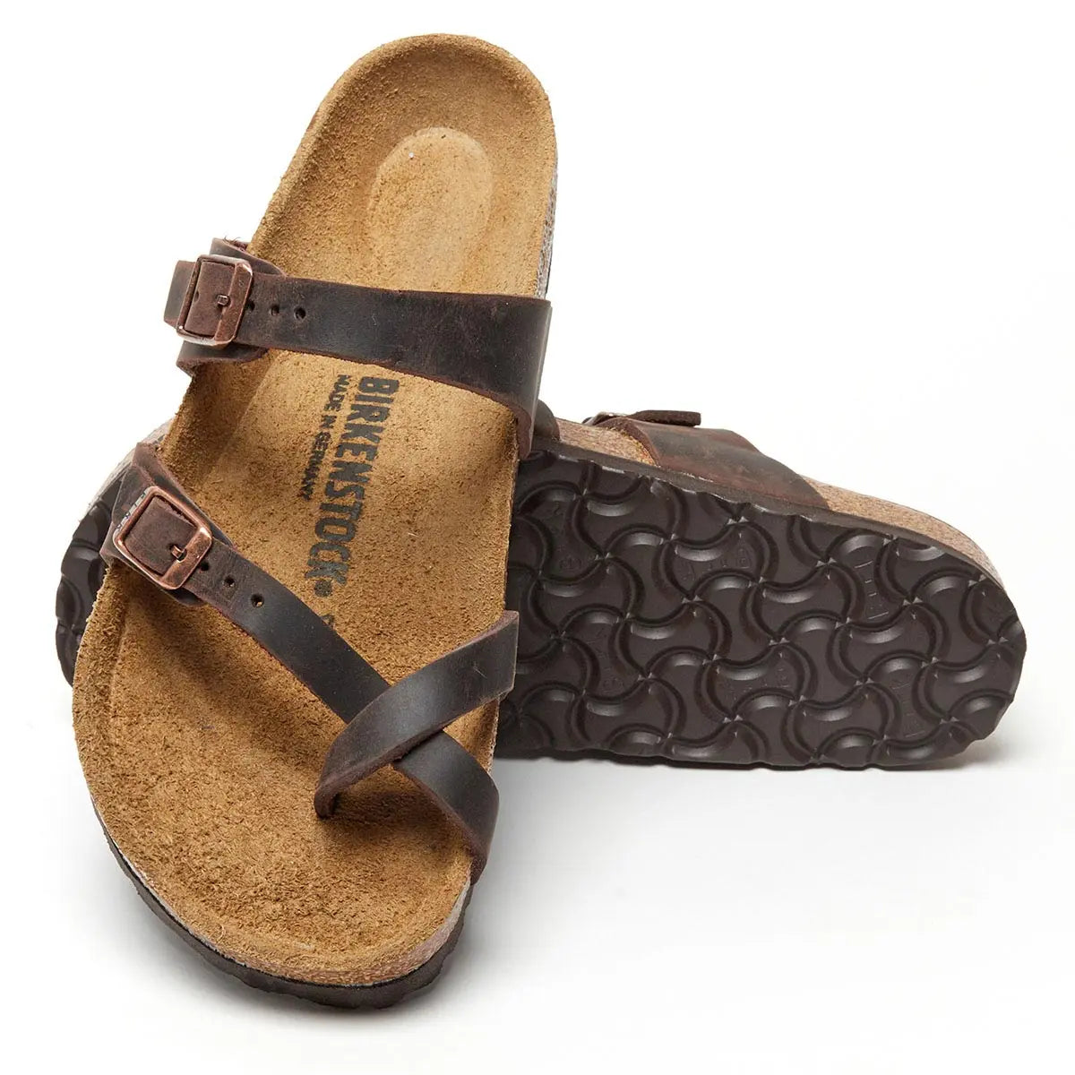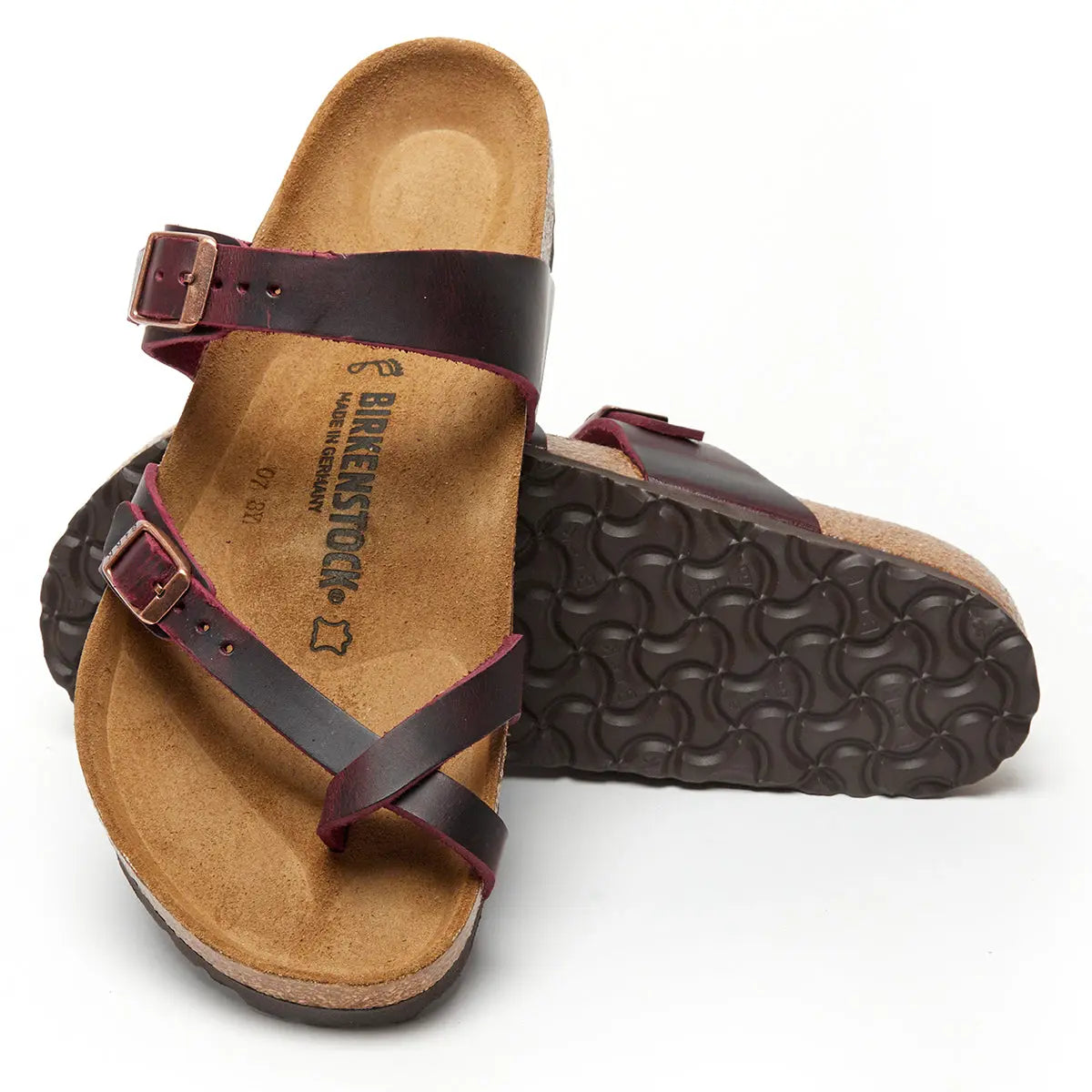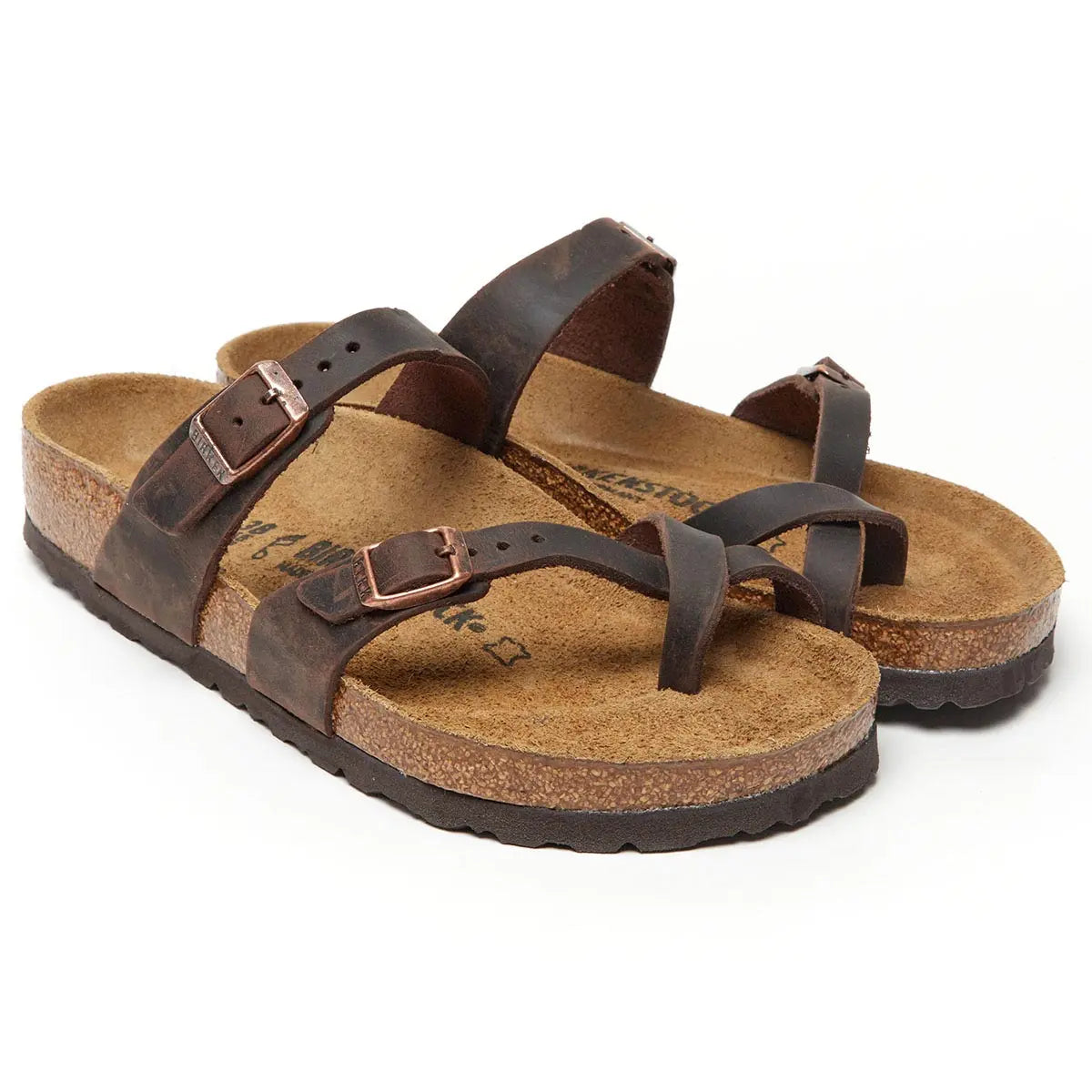 The Mayari from Birkenstock – an elegantly comfortable sandal with adjustable. crisscrossing straps that form a single loop around the toe. Featuring a microfiber footbed liner. The upper is made from oiled nubuck leather.