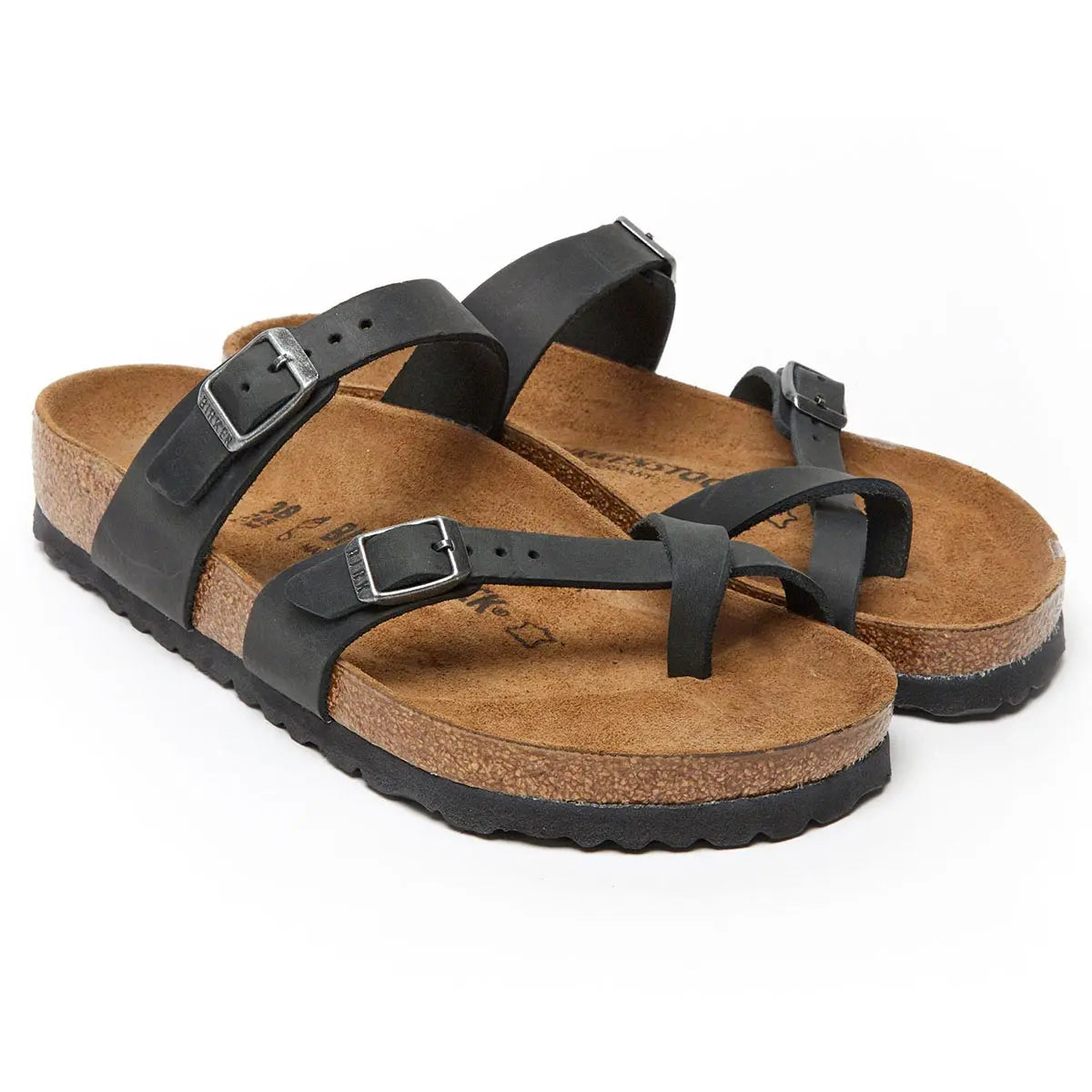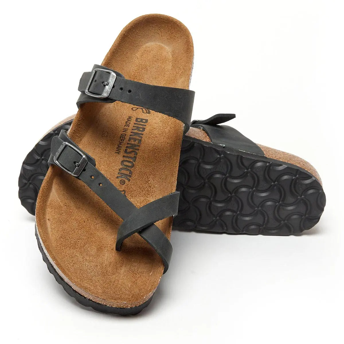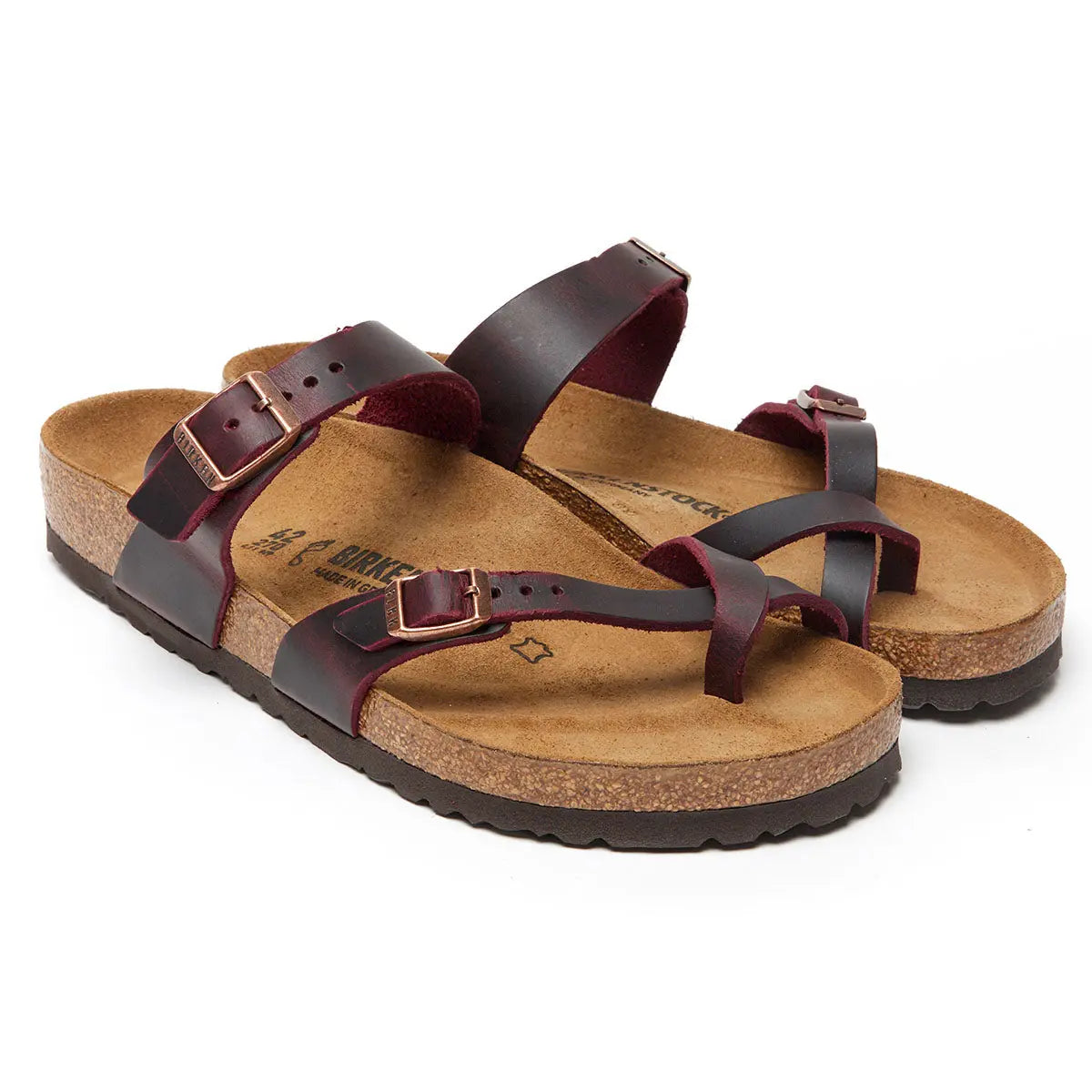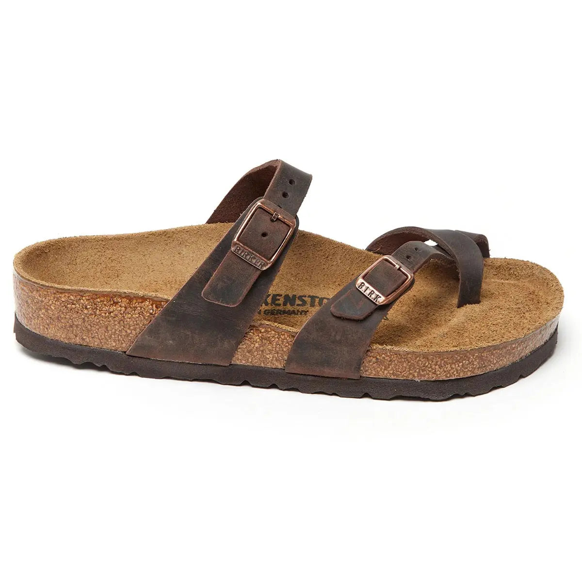 The Mayari from Birkenstock – an elegantly comfortable sandal with adjustable. crisscrossing straps that form a single loop around the toe. Featuring a microfiber footbed liner. The upper is made from oiled nubuck leather.