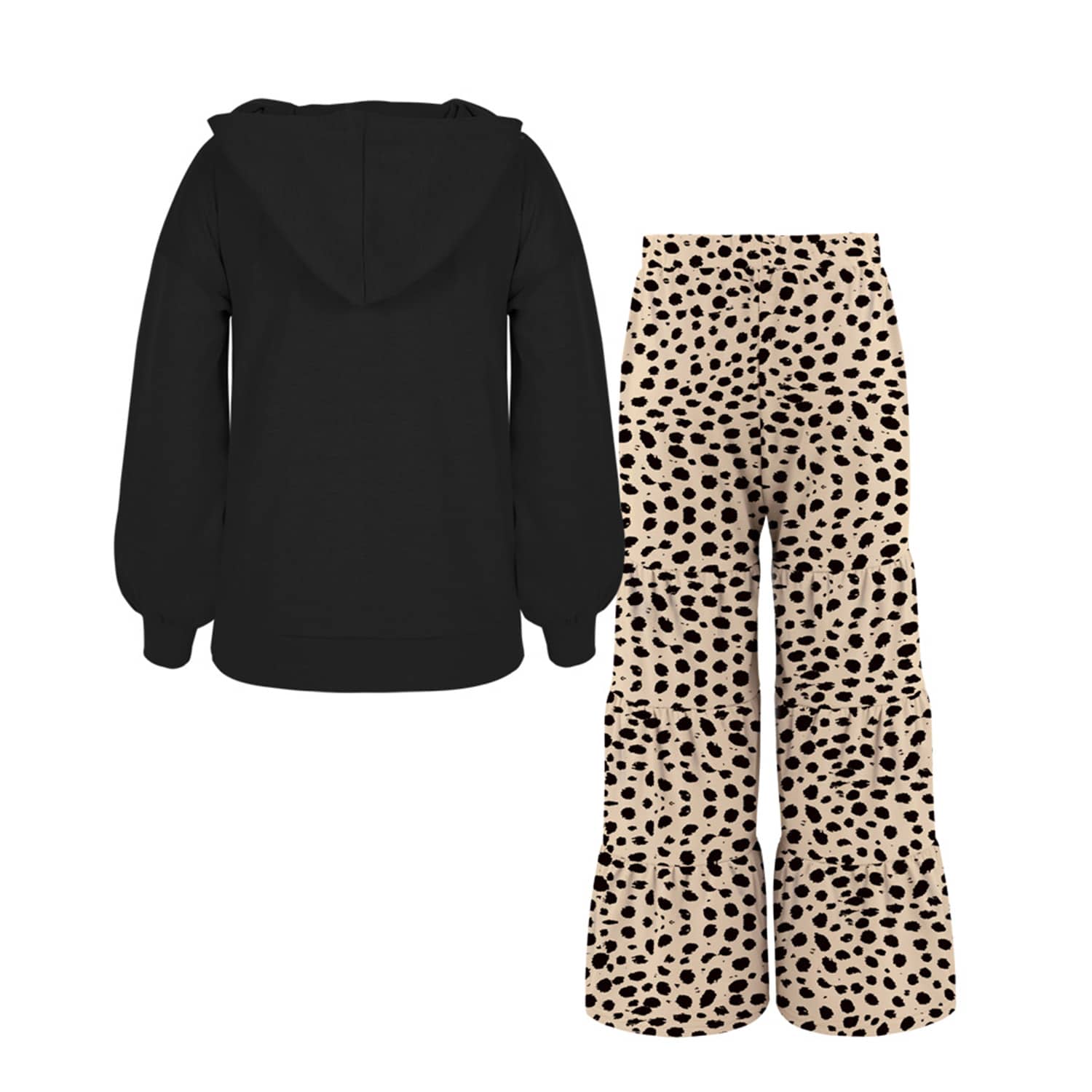 Black Leopard Heart Print Hooded Top & Leopard Print Tiered Pants
