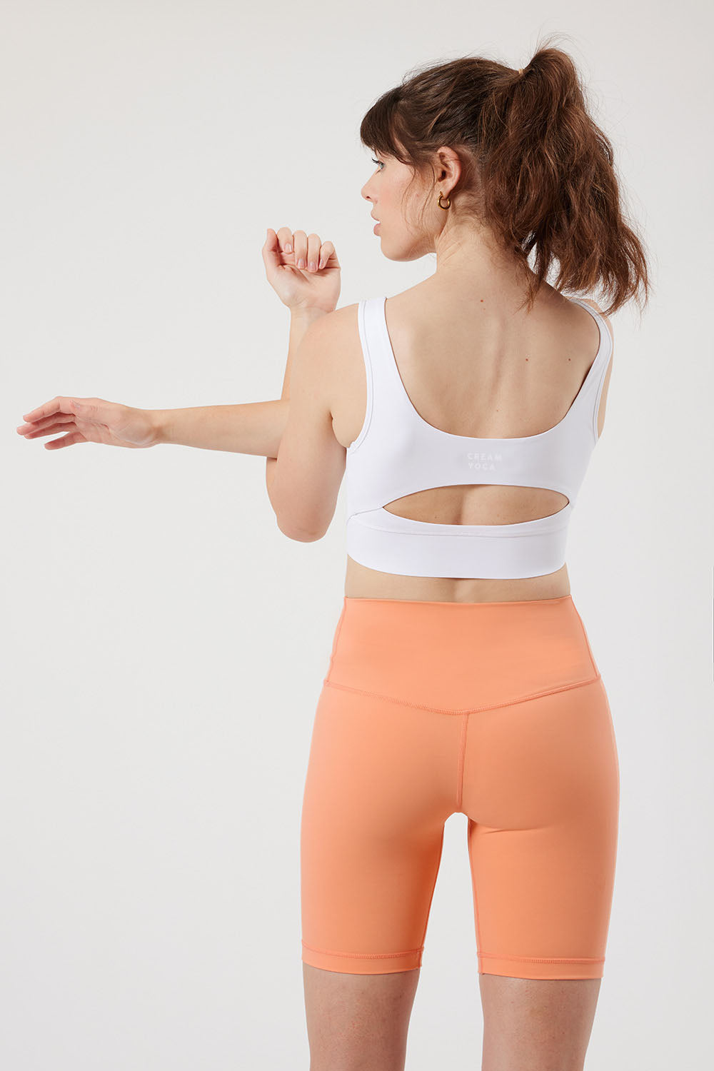 Tennis-inspired. cropped sports bra tank. minimalist sleek front. round neck. open-slit design in the back. built-in bra with removable pads. logo on center back. Pair with matching Evelyn skort for a set look.