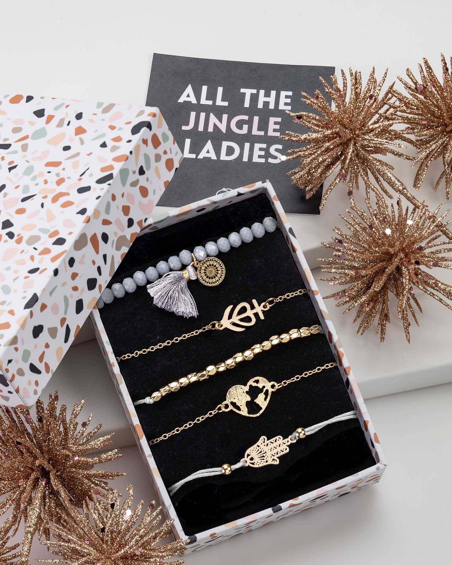 Be the first to review “Don’t AsK Goldtone Grey Beaded Bracelet Set ??Elegant Stackable Design with Terrazzo Gift Box”