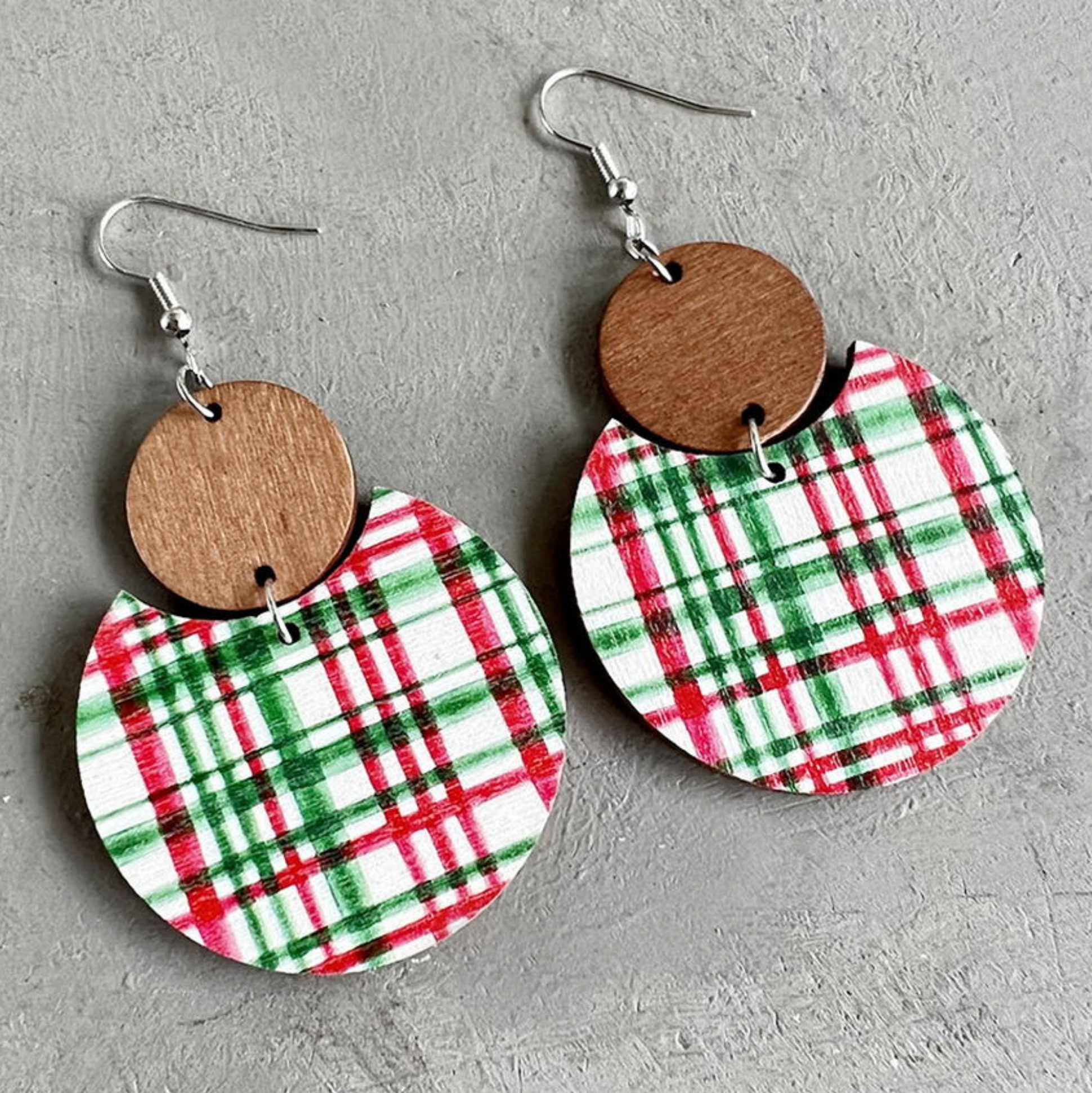 Don’t AsK Red Green Patterned Wood Circular Drop Earrings ?C Festive Holiday Jewellery for Women