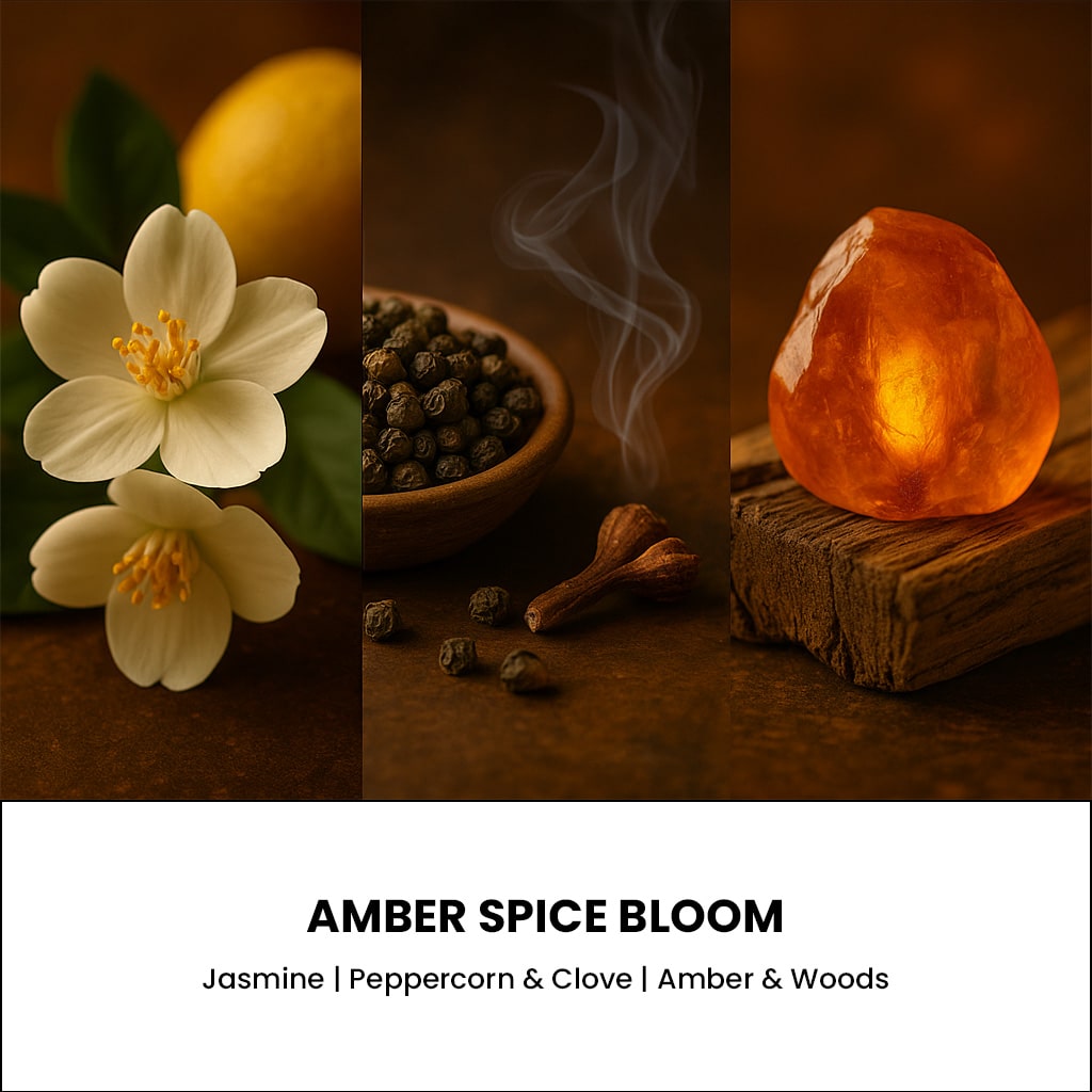 Scent Notes: Jasmine and Peppercorn invite you into a world of exotic intrigue with its fresh citrus and floral notes. Spicy clove adds depth. while amber and wood provide a warm and sensual base.