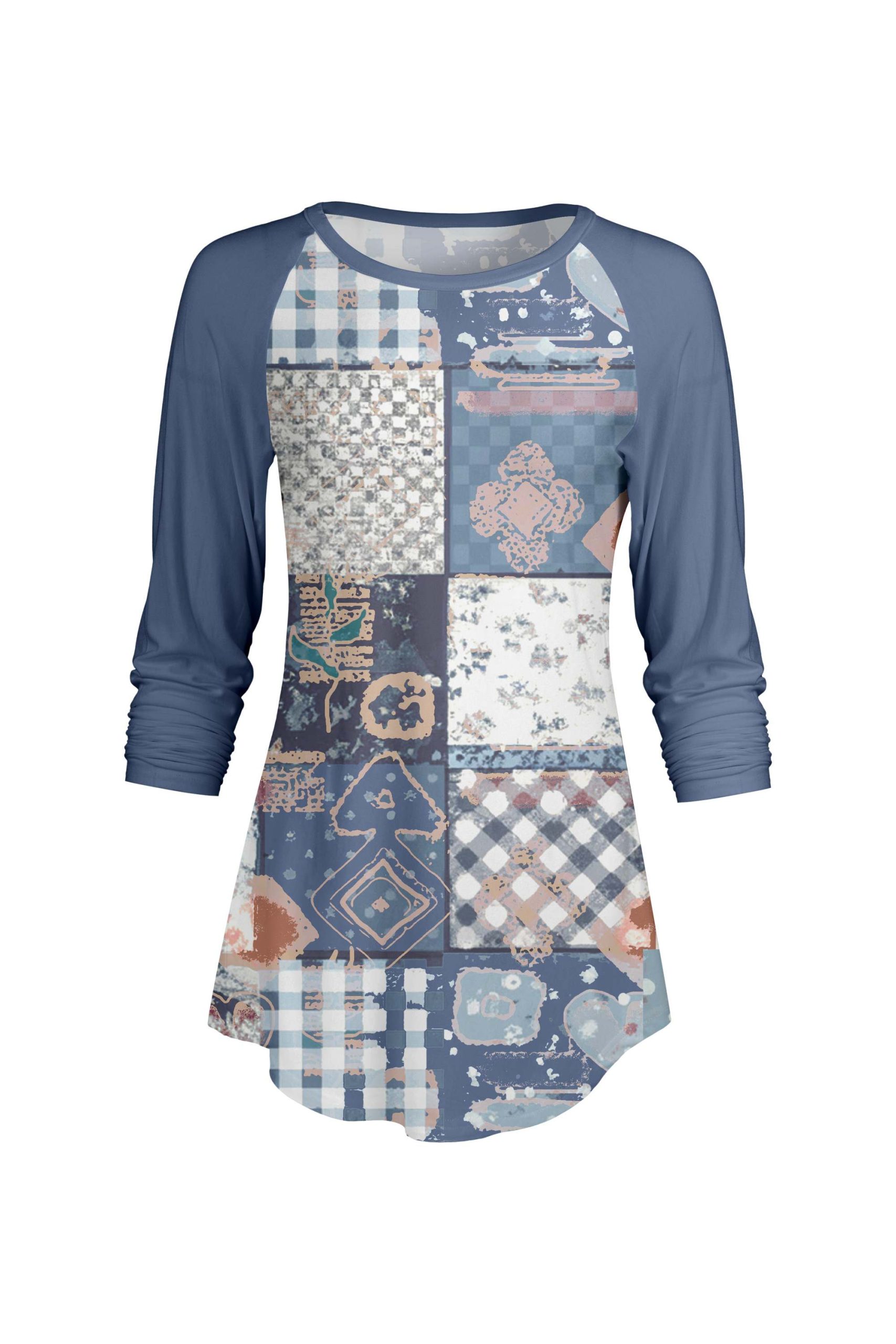 Lily by Firmiana Women’s ¾ Sleeve Scoop Neck Tunic Top Blue & Beige Patchwork