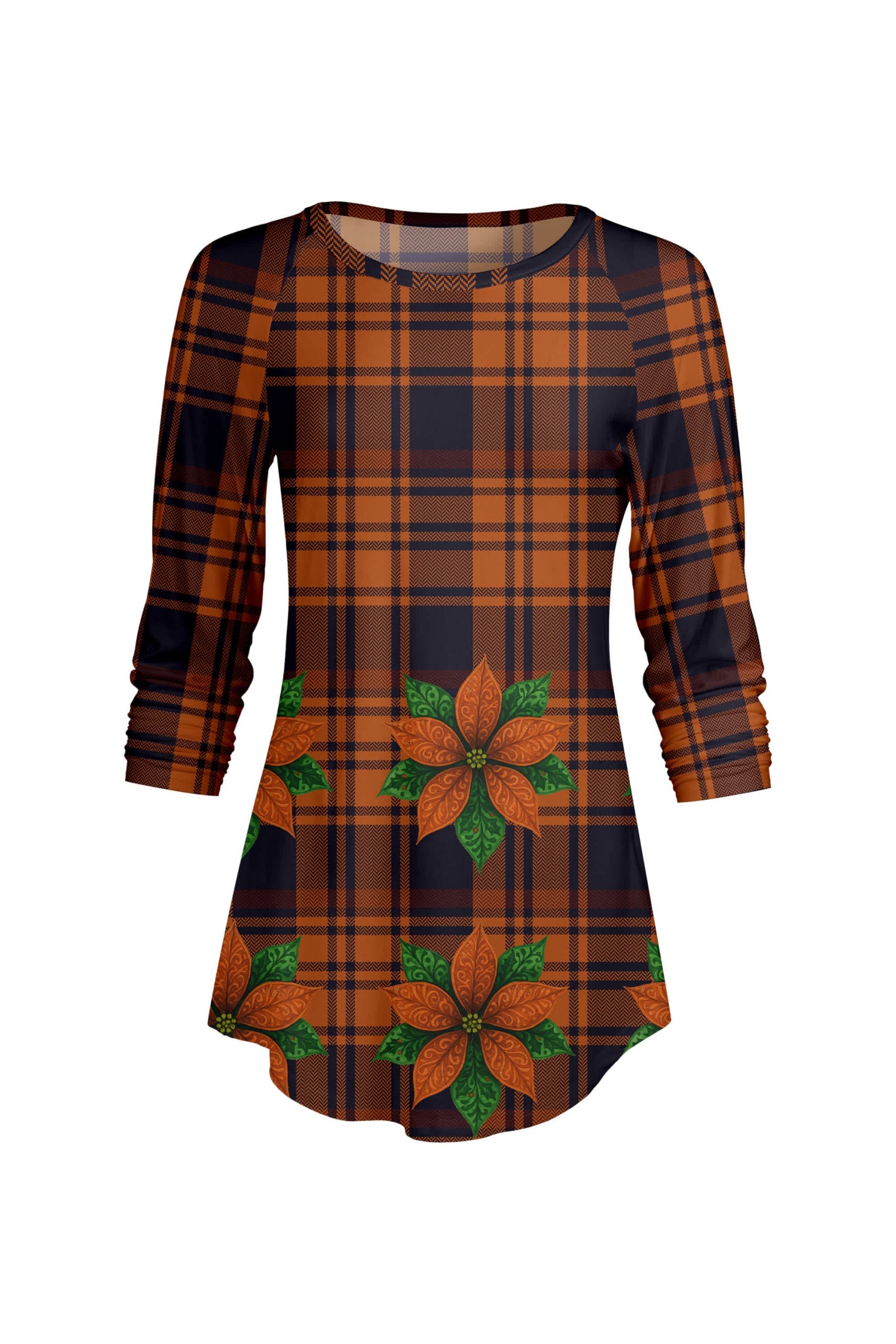 Lily by Firmiana Women’s ¾ Sleeve Scoop Neck Tunic Top Rust Plaid Floral Border
