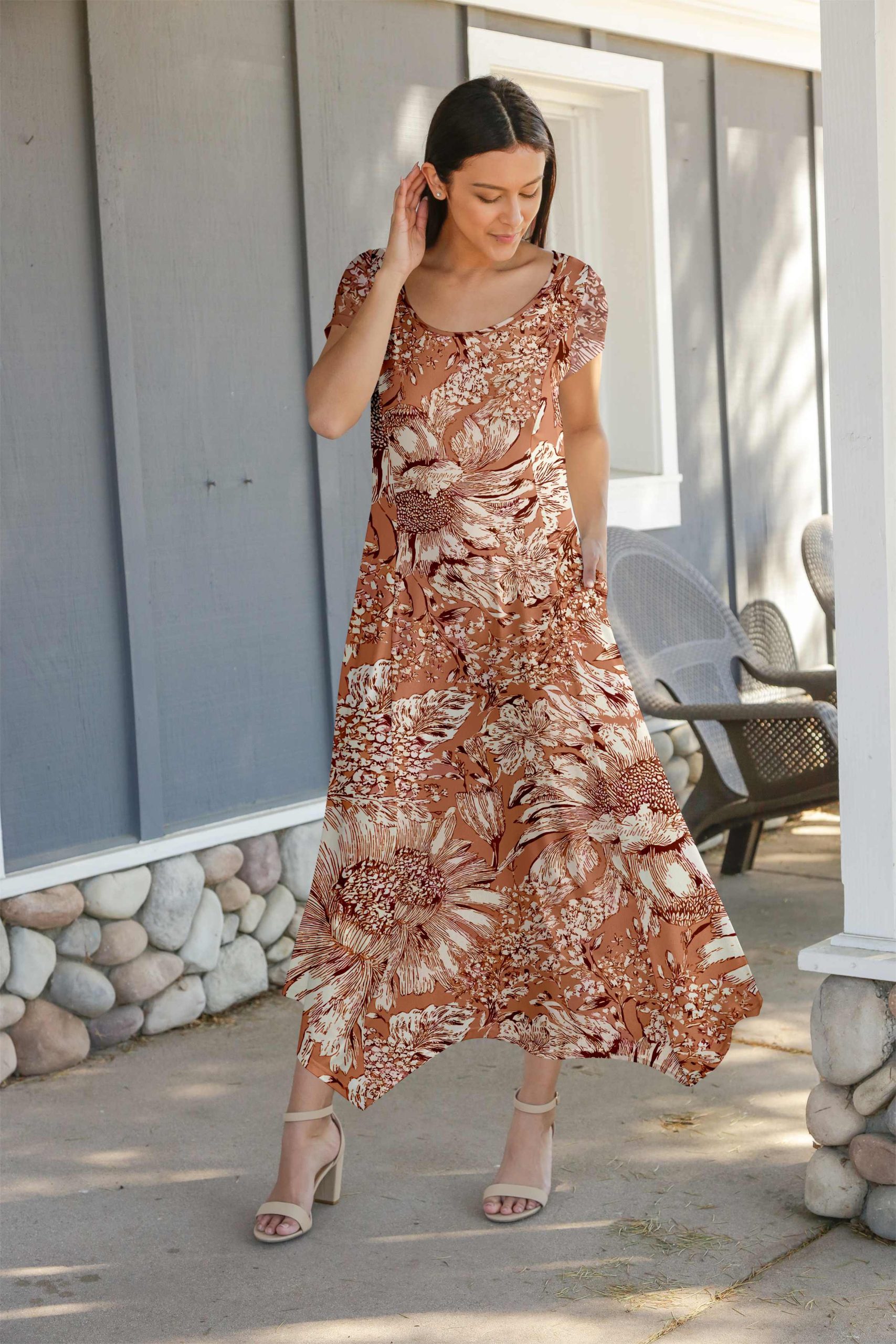 Lily by Firmiana Women’s Cap Sleeve Fishtail Maxi Dress Brown & Tan Leaf Mix