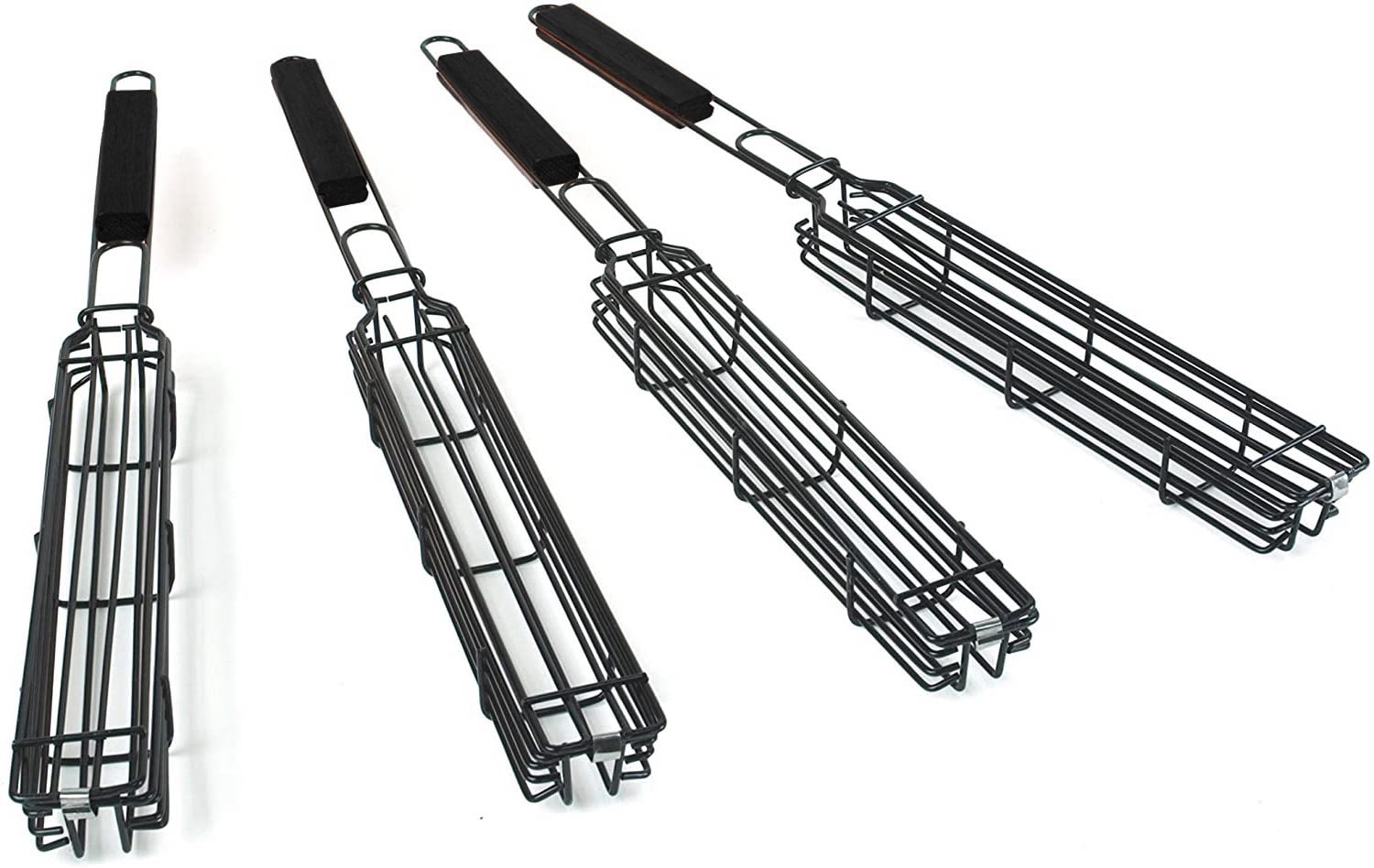 Outset Non-Stick Kabob Grill Basket. Set of 4. Carbon Steel with Hardwood Handle. Black. 19.5 x 2 x 1.5 Inch