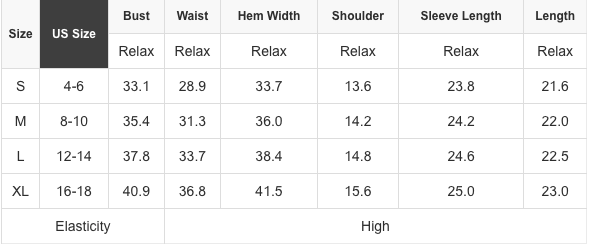 L – 12/14, M – 8/10, S – 4/6, XL – 16/18