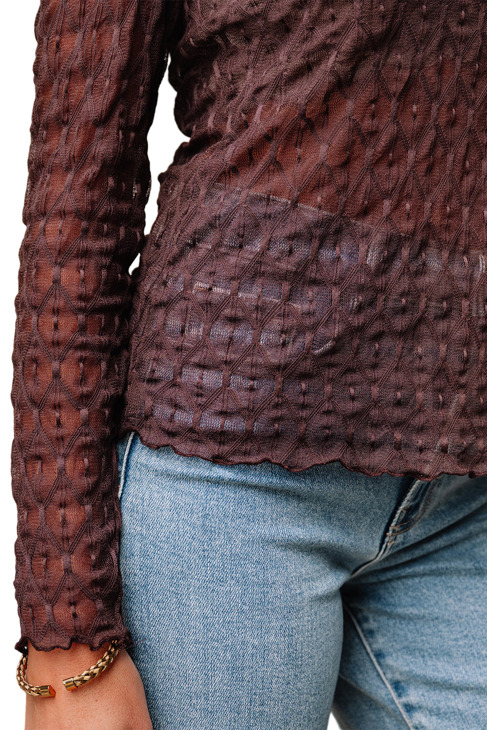 This top features a sheer mesh fabric for a trendy. bold vibe. Its distinctive pattern brings a stylish flair. while the delicate lettuce trim adds a sweet. girly touch. The slim fit hugs your shape beautifully. making it as flattering as it is fun.